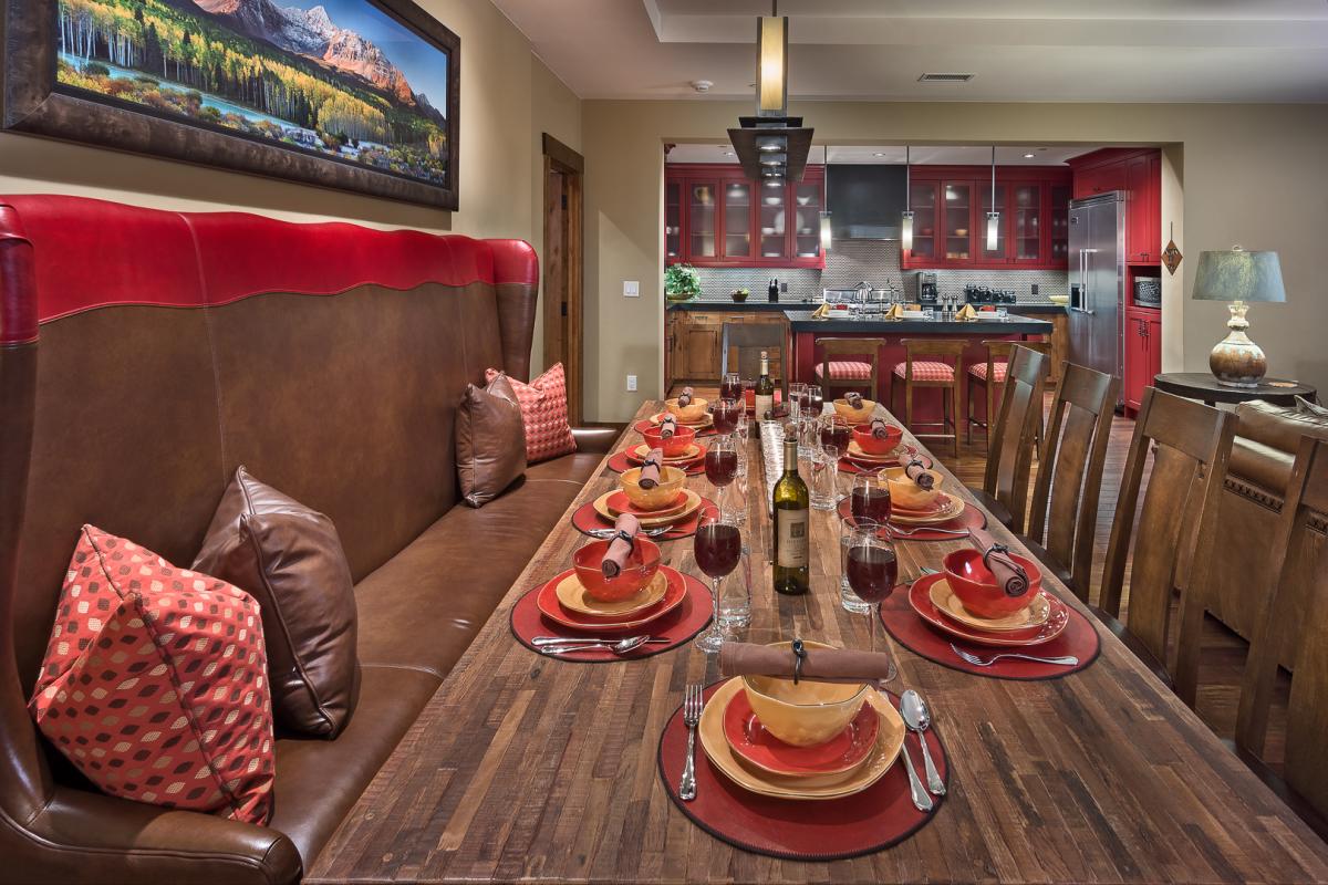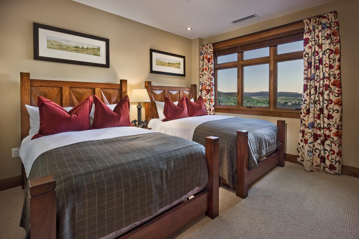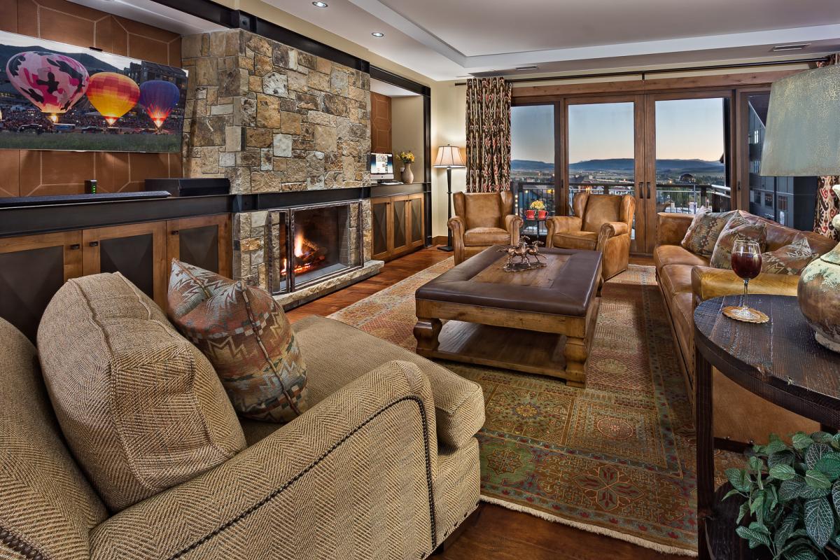 One Steamboat Place residences feature rich colors, natural textures, and sumptuous fabrics throughout. Each master bedroom offers a gas fireplace. The main master bath features a steam shower and Jacuzzi tub. In this residence 2 bedrooms offer a King bed with private bath. The third bedroom has two full beds, and the fourth bedroom offers an impressive bunk set up with two queens and two twin beds, all with private bathrooms.