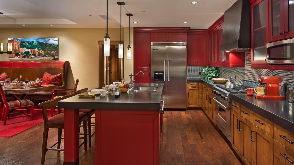 The kitchen is professionally equipped with Viking appliances. From the deck, you can grill on your gas BBQ as you look past the clock tower that sits atop the Steamboat Gondola building to watch skiers and riders make their last few turns at the base of the ski area.