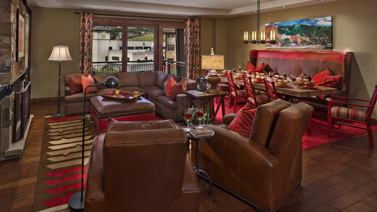 Sitting on the fifth floor, the Grouse Mountain Residence has a bird’s eye view of the outdoor fire pit in the One Steamboat Place plaza below. The open floor plan connects the living and dining areas to the kitchen with plenty of room for the entire group to gather.