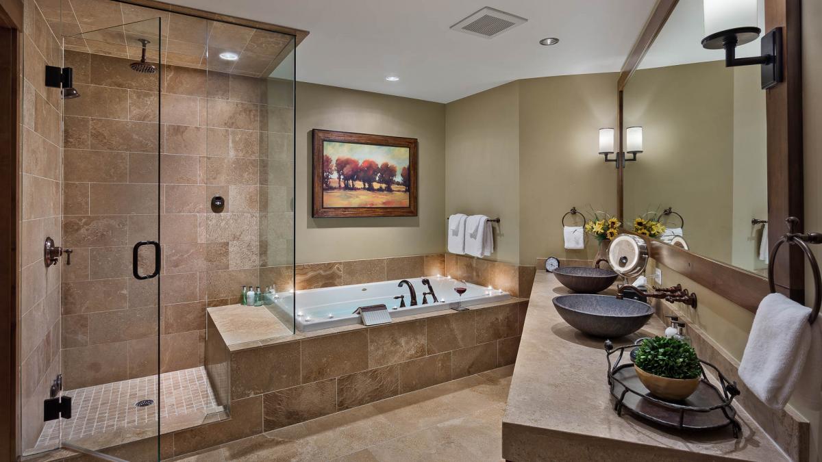 Guadalupe Mountain offers a Master Bedroom with King bed, gas fireplace and an oversized ensuite bathroom with steam shower, double sink vanity, rain showerhead, and Jacuzzi tub. The Guest Master also offers a King bed, the third bedroom offers a Queen bed and the fourth offers two Full beds, all with full private bathrooms.