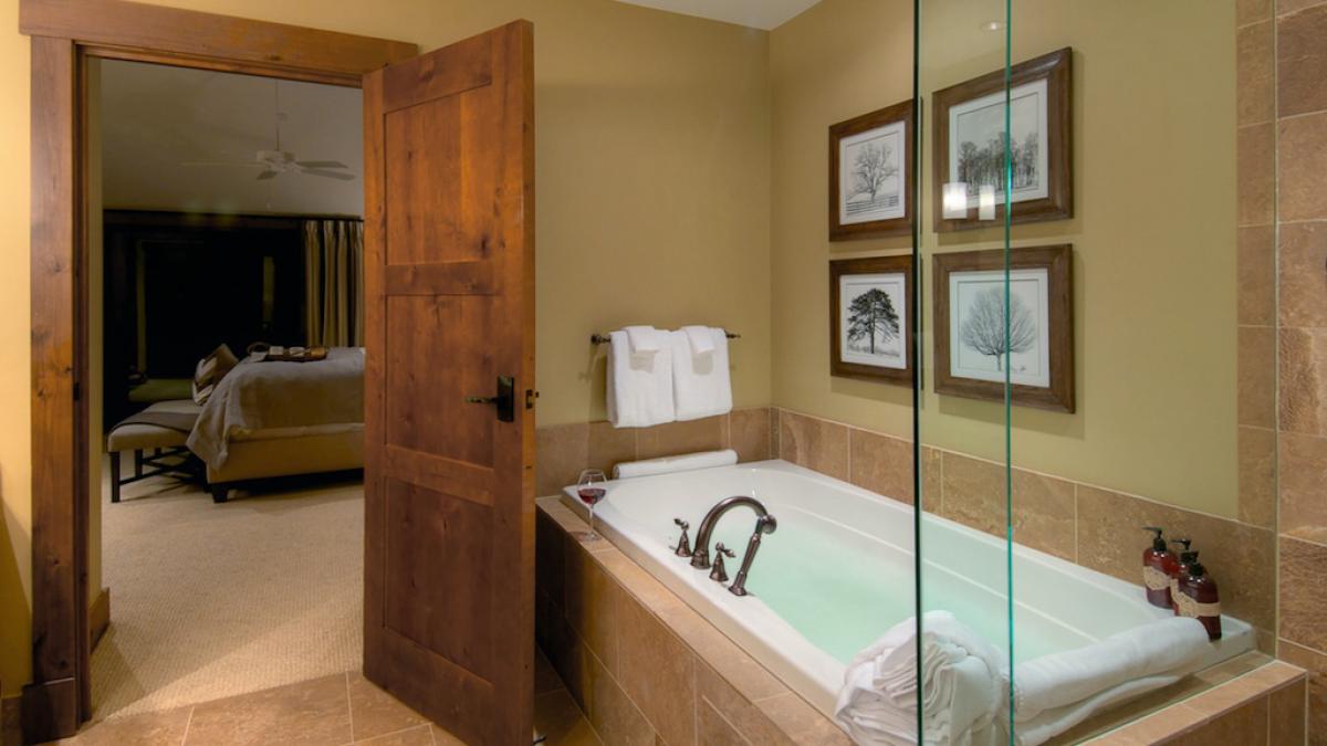 • Bedroom 1: Primary with king bed, en suite bathroom with shower and bathtub, fireplace