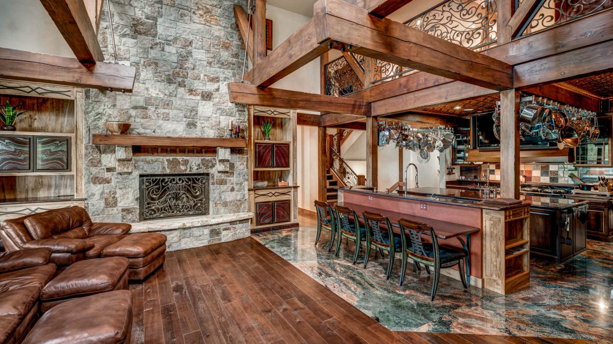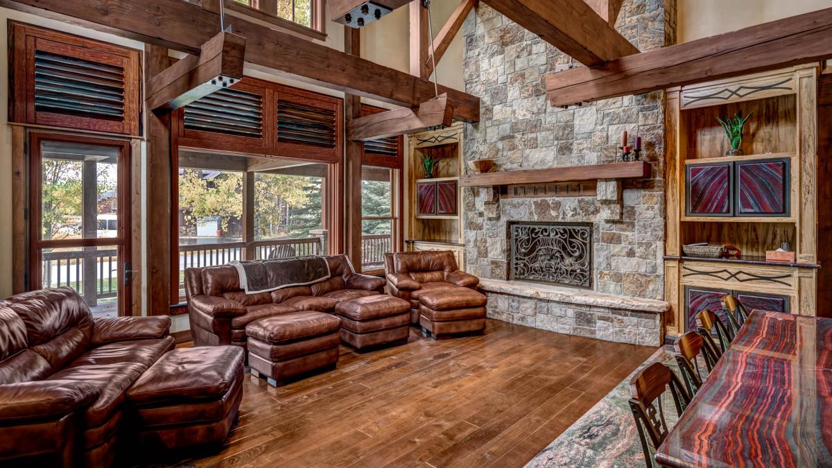 The large great room makes use of exposed wood beams to create an expansive space inviting groups to relax on over stuffed sofas and enjoy the fire. Guests can access rocking chairs on the covered deck and enjoy coffee or refreshers while taking in the mountain views.