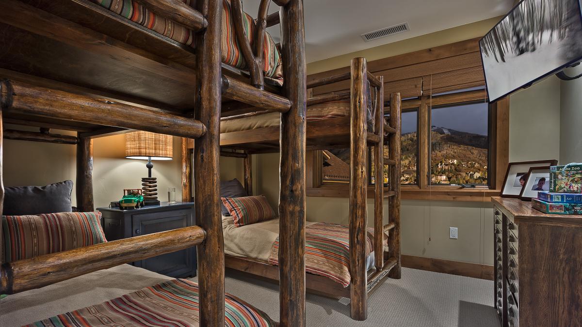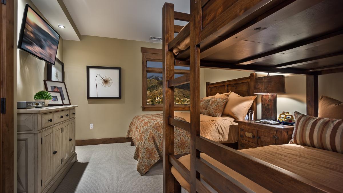 All One Steamboat Place residences feature luxurious furnishings and décor throughout the home. Each master bedroom offers a gas fireplace and the master bath features a steam shower and Jacuzzi tub. In this residence 2 bedrooms offer a King bed with private bath, one offers a Queen bed with two full-sized bunk beds and a private bath, and the fourth offers 2 sets of twin bunks, also with a private bathroom.