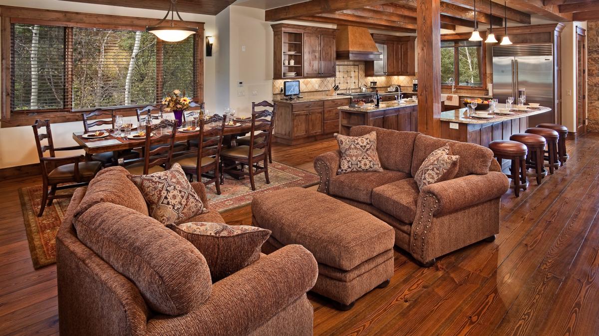 Sun Ridge Lodge's Great Room offers an indoor space to enjoy the views on cold days and nights. This room features windows stretching nearly the length of the walls to the peak of the ceiling. The loft area above the great room is a perfect locatoin to see the sunset and admire the timber trusses.