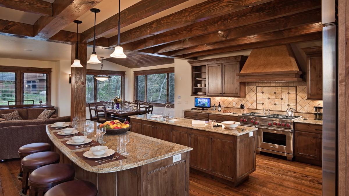 Sun Ridge's gourmet kitchen is just off the Great Room and offers a Wolf gas range and Sub Zero refrigerator. The kitchen is home to dual islands that each offer plenty of prep or entertaining space. Ten guests can be accomodated at the dining room table, while an additional four can be hosted at the bar.