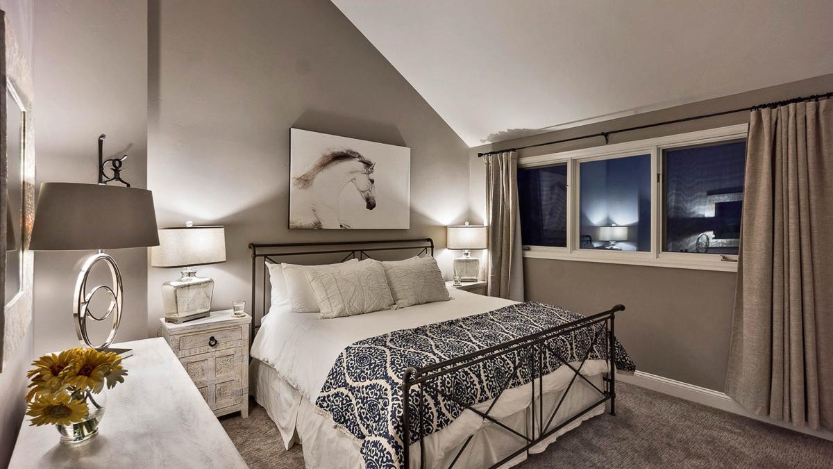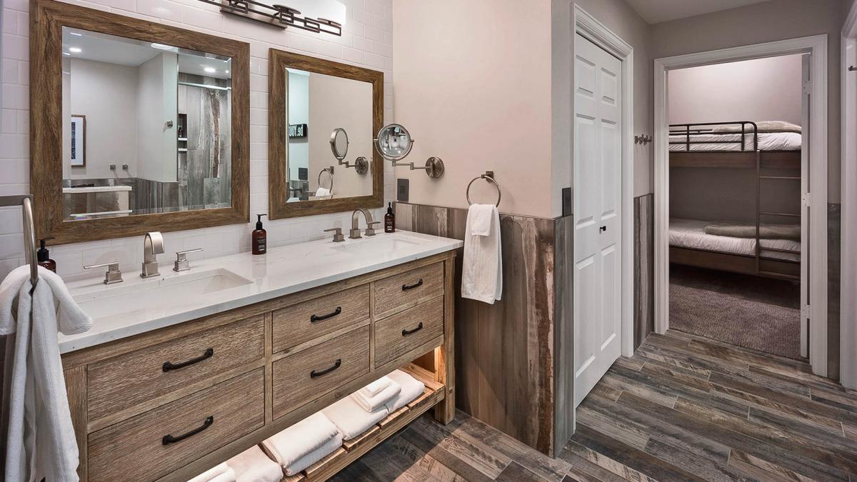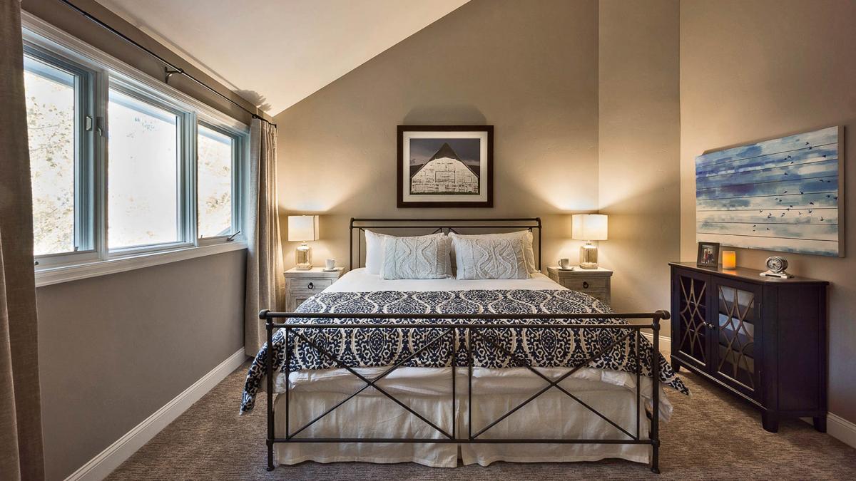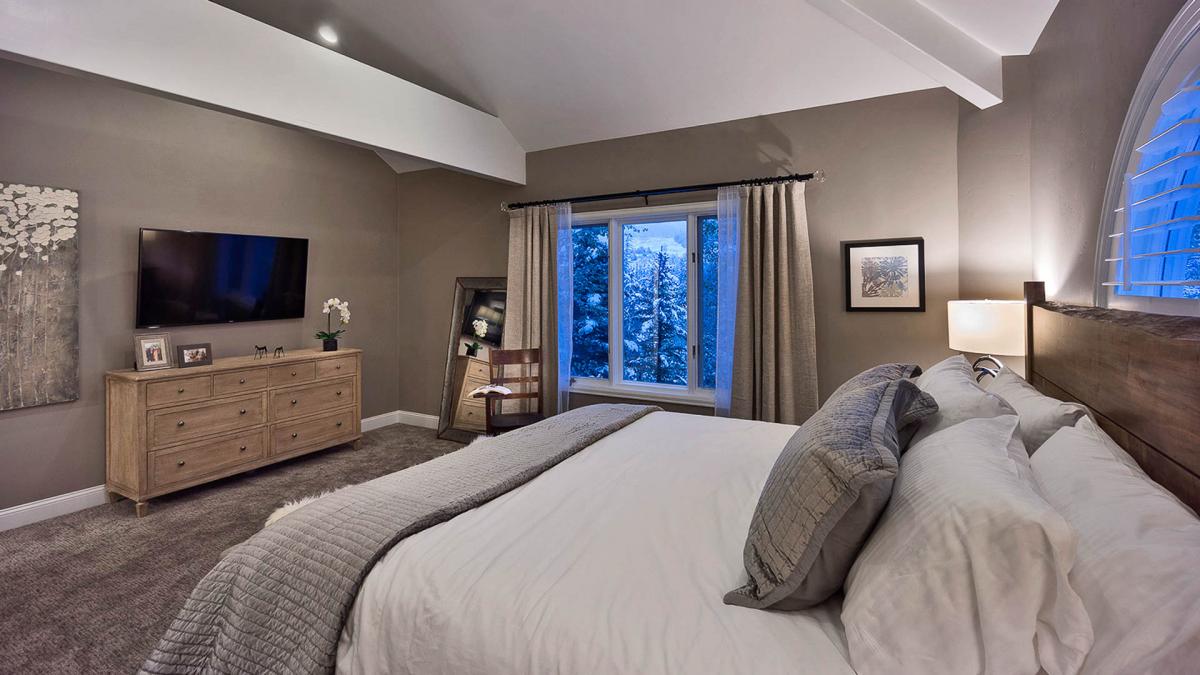 Primary: King bed, vaulted ceilings, mountain views, en-suite bathroom with dual vanities, 6-head shower, soaker tub