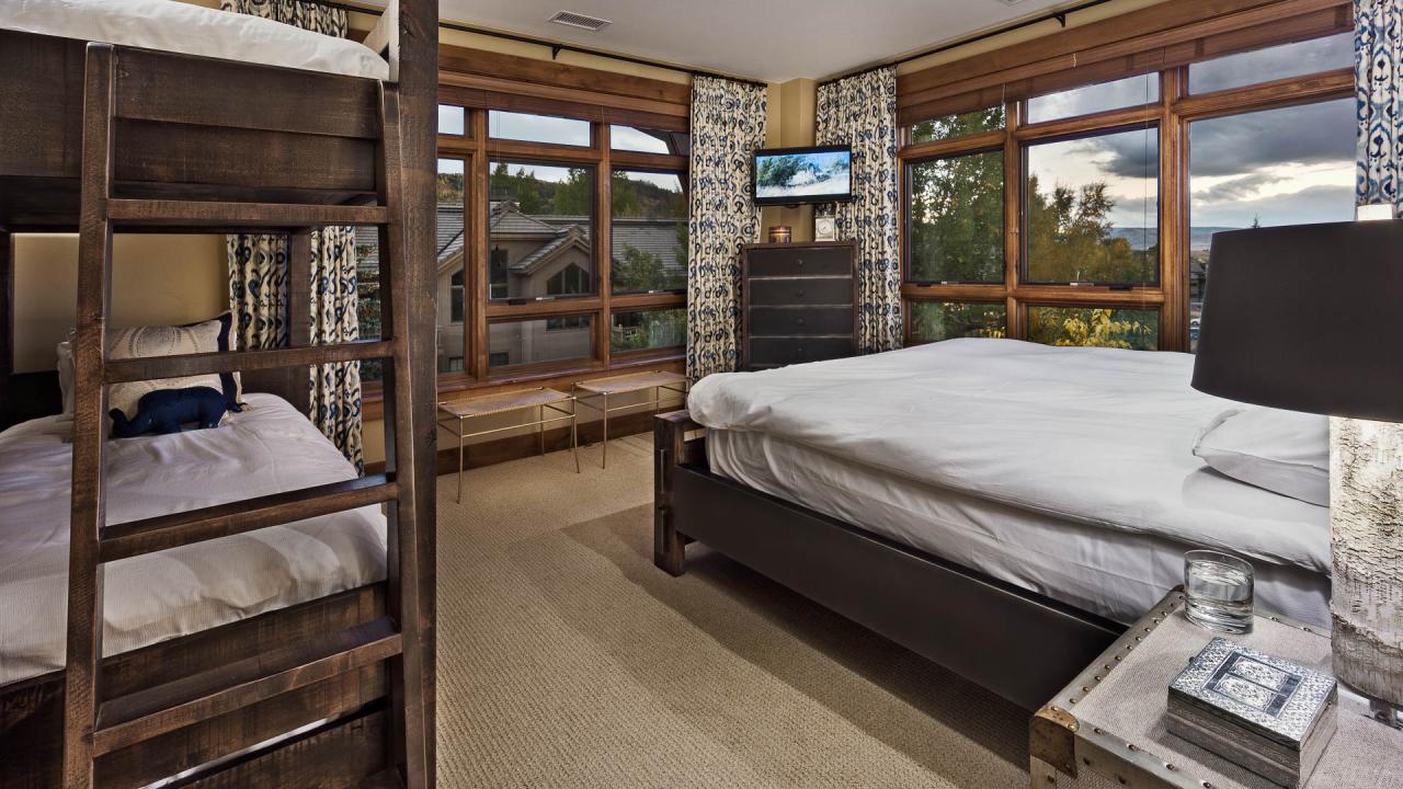 There are three bedrooms in this grand residence, all with high end mattresses. The master bedroom will delight you with the birch tree wall, custom furniture, custom marble lotus flowers, petrified wood night stand and gas fireplace. The master bath features a steam shower and Jacuzzi tub with TV and separate make up area. The second bedroom also offers a King bed plus twin bunk beds and a twin trundle bed. From the room you can view the ski mountain or out of the other side to the flat-tops through giant windows. This bedroom has a slightly more industrial feel with the custom alder wood and walnut furniture. When you aren’t enjoying the views there is a flat screen tv and custom art work from Christy Freeman. The third bedroom offers a Queen bed with hand sewn tapestry and custom Colorado red stone end tables and dresser. The living room also has a Queen Sleeper-Sofa.
