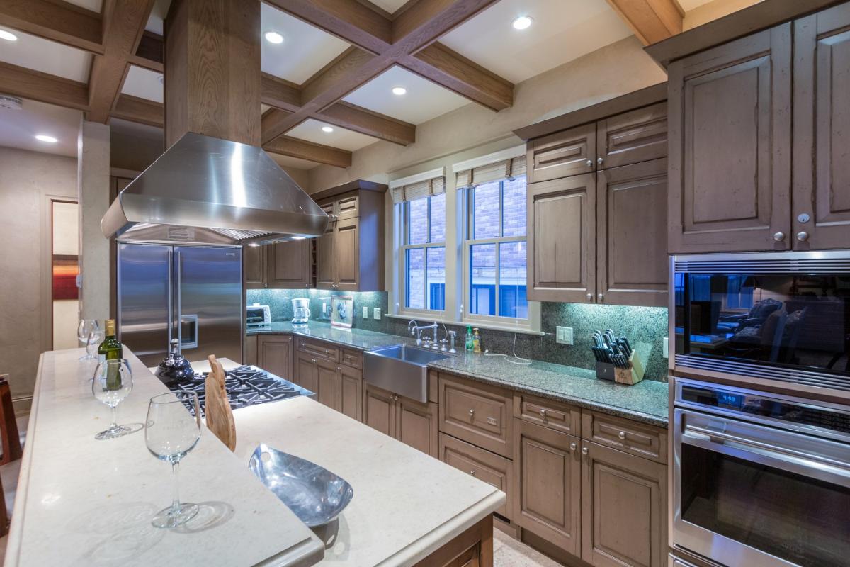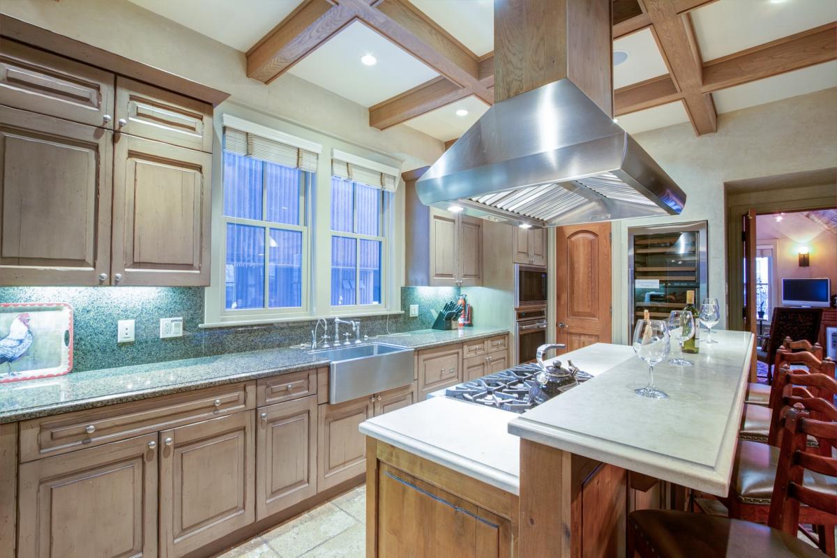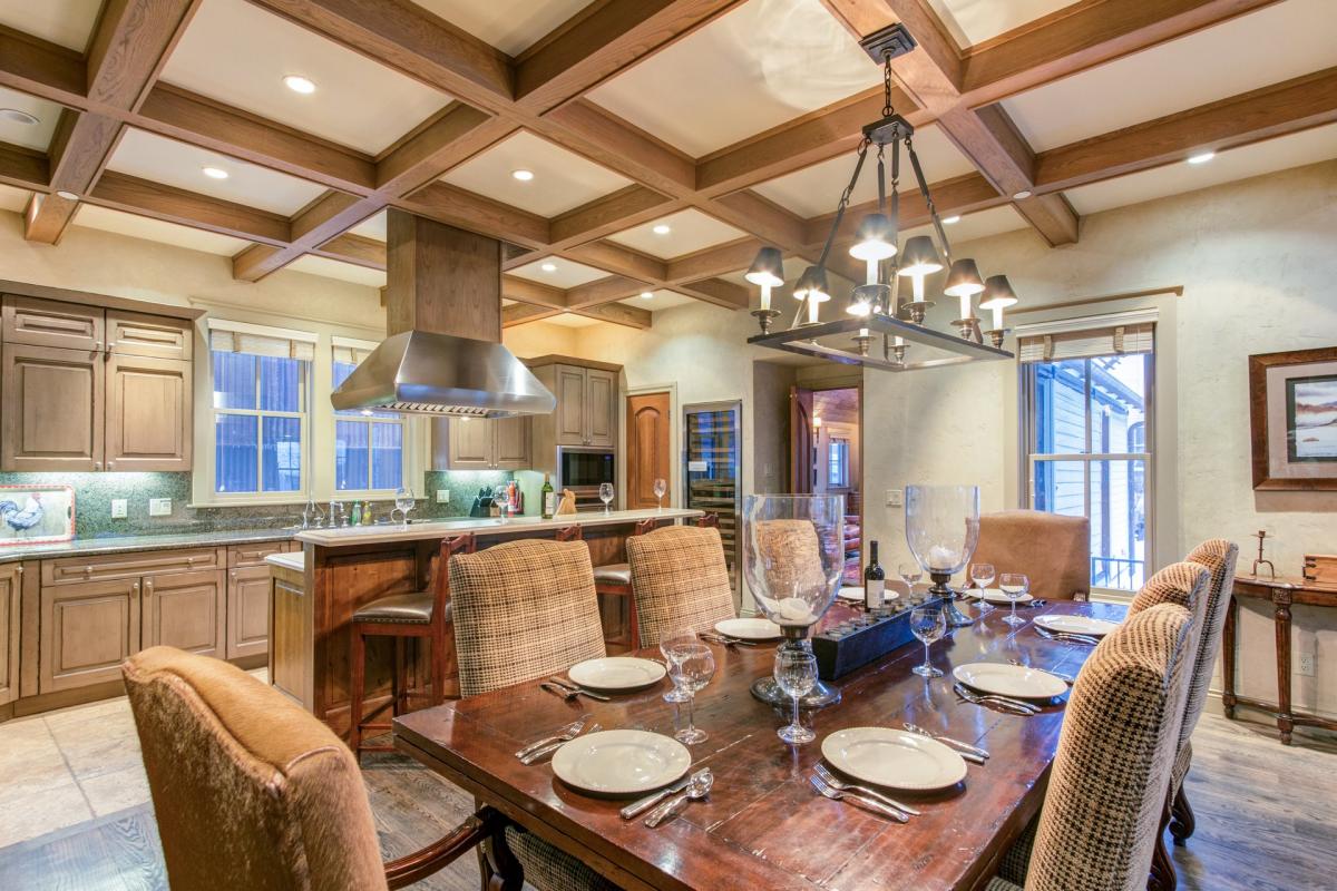 Upon entering this home, guests will find ski storage to the left and cubby storage for hats and gloves to the right. Straight ahead is the home’s lovely living area, lined with plenty of seating surrounding a gas fireplace and flat screen TV wired with surround sound. The dining room has seating for eight around a large wood table, which is immediately followed by a gourmet kitchen that would make any chef proud! Stainless steel appliances from Wolf & SubZero, a full-size wine refrigerator and marble and granite countertops create an incredible atmosphere for creating your next inspired meal. Off the west side of this kitchen is a small powder room, followed by an outdoor deck with barstool seating for two and a gas grill. Off the opposite side of the kitchen is the den with a cozy seating area, flat screen TV, desk, French doors to the front patio and wet bar – the perfect space for entertaining!