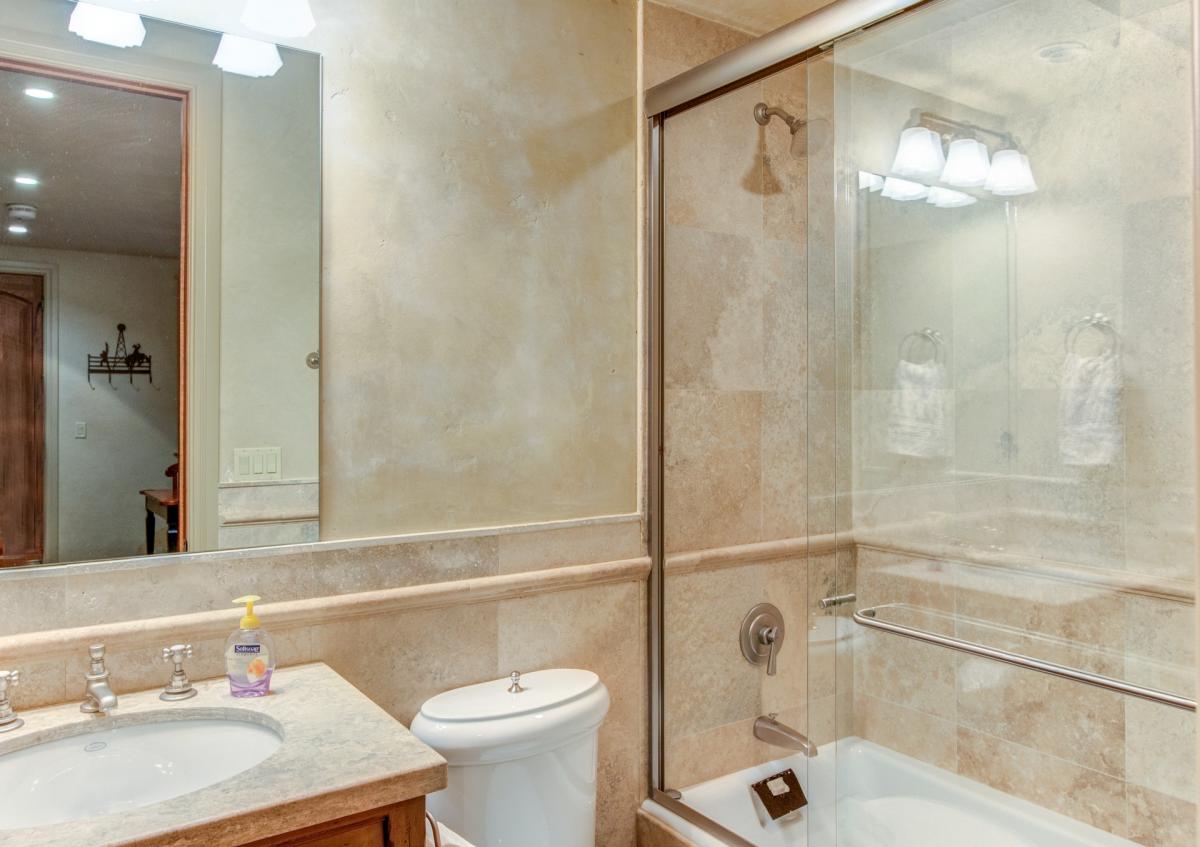 Additional bedrooms are located on the lower level. Guest 3 offers a queen size bed and en suite bathroom featuring a steam shower with bench seat. 211 South Oak offers two special rooms for teans or children.. Each room offers multiple bedding options and shares a media room between them. The media room features a large sofa, game table, mini fridge and large television.