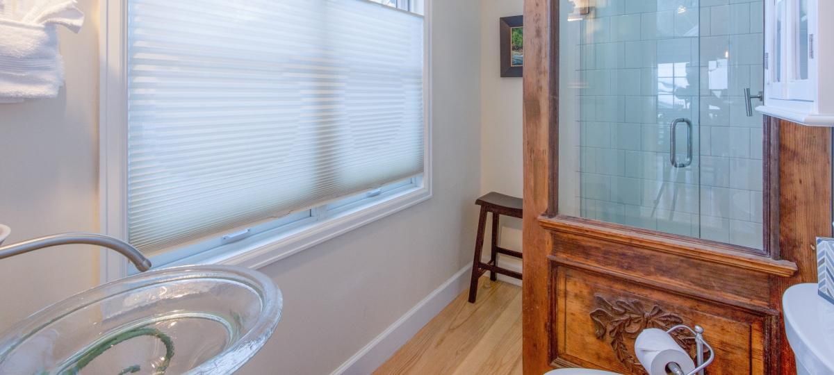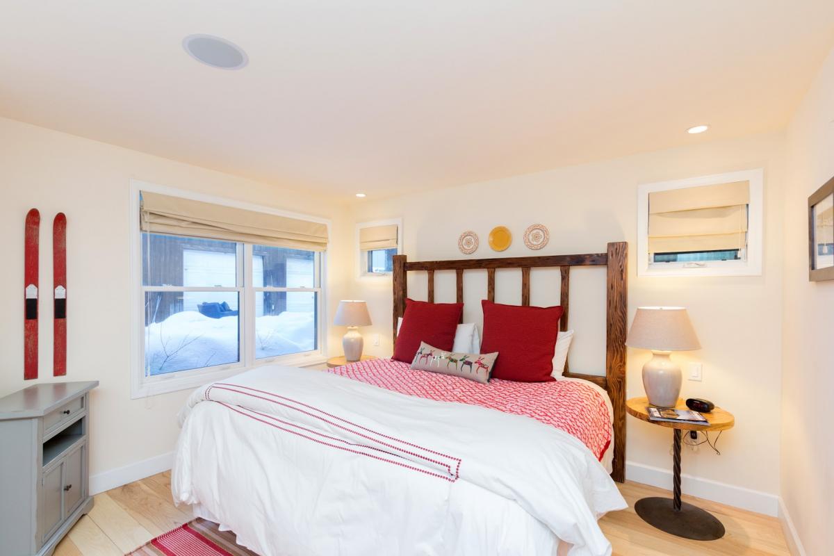 The home has a contemporary, fresh and light-filled interior, which spans three levels. Guests enter the home from street level to the lower level of the house where there are two bedrooms. One bedroom has a twin bed with a pull-out trundle. The other bedroom has a king-sized bed. These two downstairs bedrooms share a bathroom.