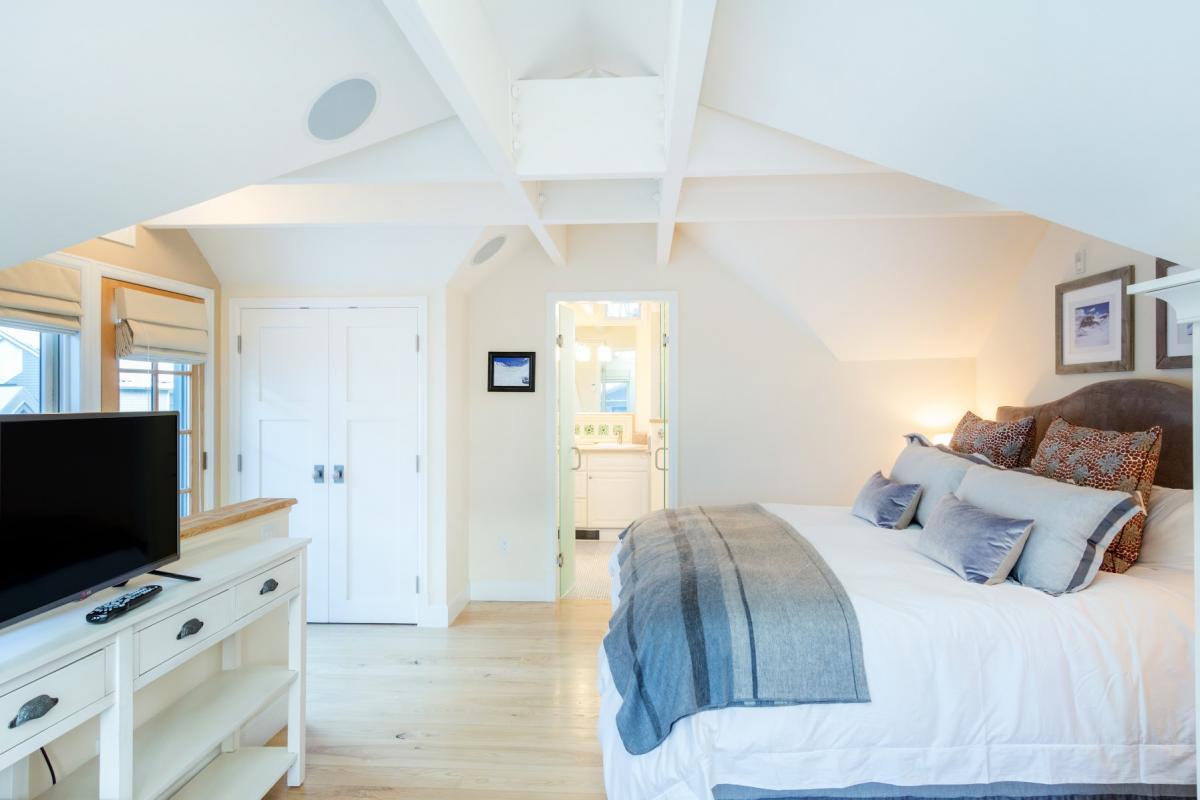 On the upper level of the home, there is a chic master suite with an inviting king-sized bed, matching armchairs, plenty of wardrobe space and a flat-screen TV. The master bathroom has a steam shower and double sinks. There is also a small private deck off the master bathroom.