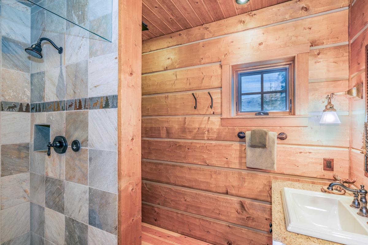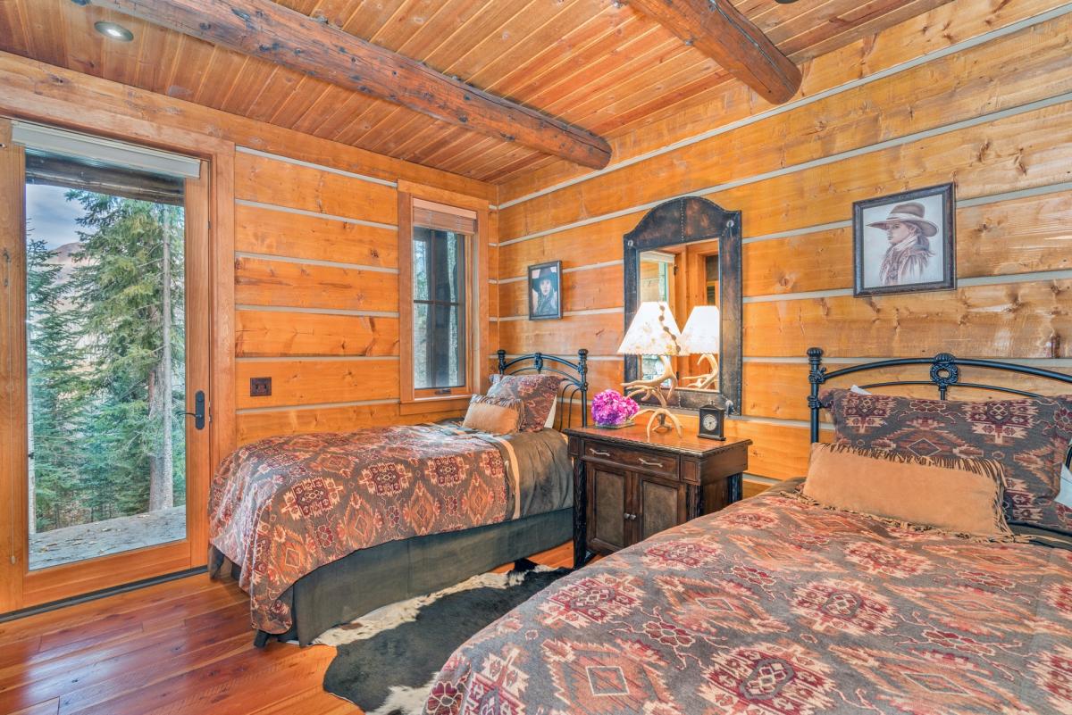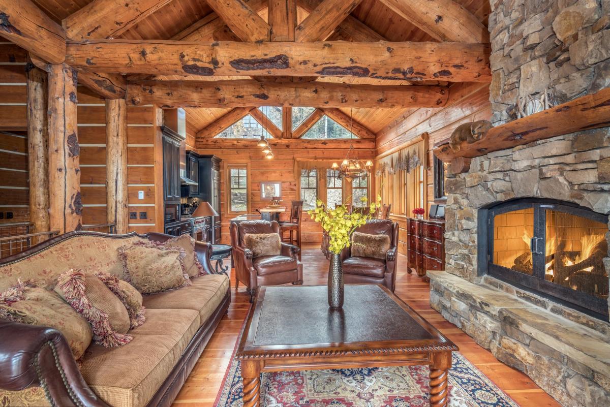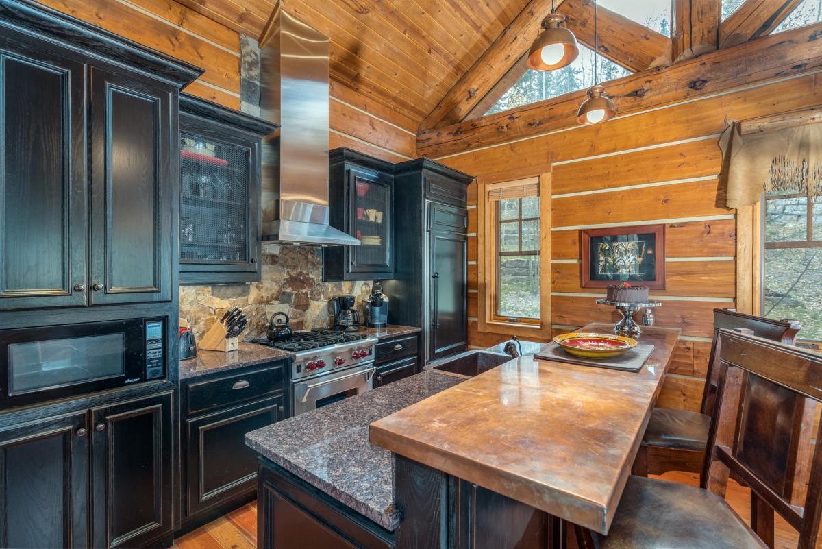 A gourmet kitchen and formal dining with wet bar lie just beyon the great room. Chefs will appreciate the fully equipped kitchen featuring stainless steel Wolf oven and Keurig coffee maker. Guests at Mountain Creek Lodge can sit at the copper bar (seating for two) or formal dining area (seating for four). The entire area is complete with windows to allow the sun's rays into the living space.