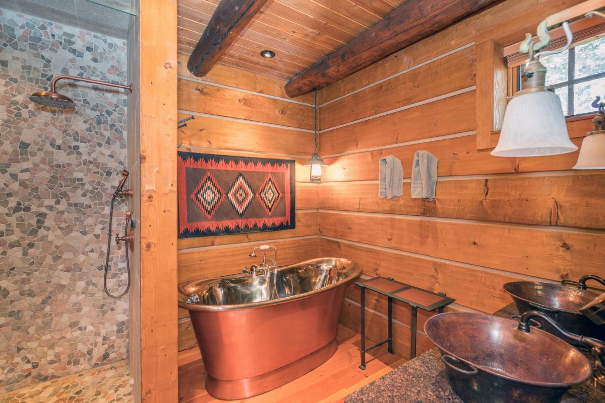 Both the master and guest suite in the main house feature en suite bathrooms. The master suite features a western copper soaker tub, steam glass shower, and dual copper sinks. The master suite also includes private patio access.