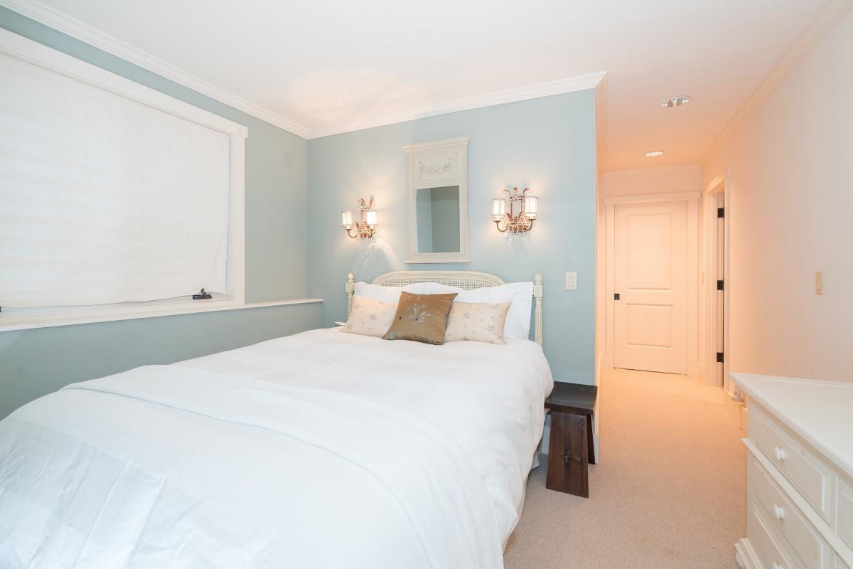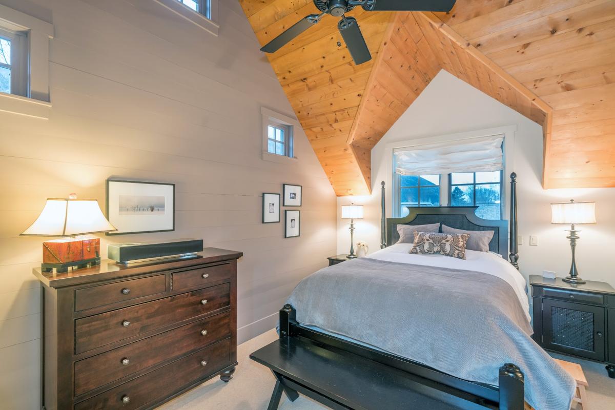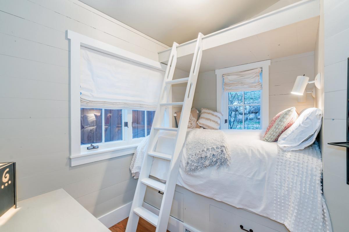 Serving this space and the full guest bedroom that follows is a lovely guest bath, up just a few steps and off to the left with painted brick tile throughout complemented by white shiplap, pedestal sink and shower/ tub combination. Beyond this bathroom is an additional guest room, with vaulted ceiling, hard wood floors and similar white painted shiplap throughout. This unique room offers a raised full bed and small loft area above.