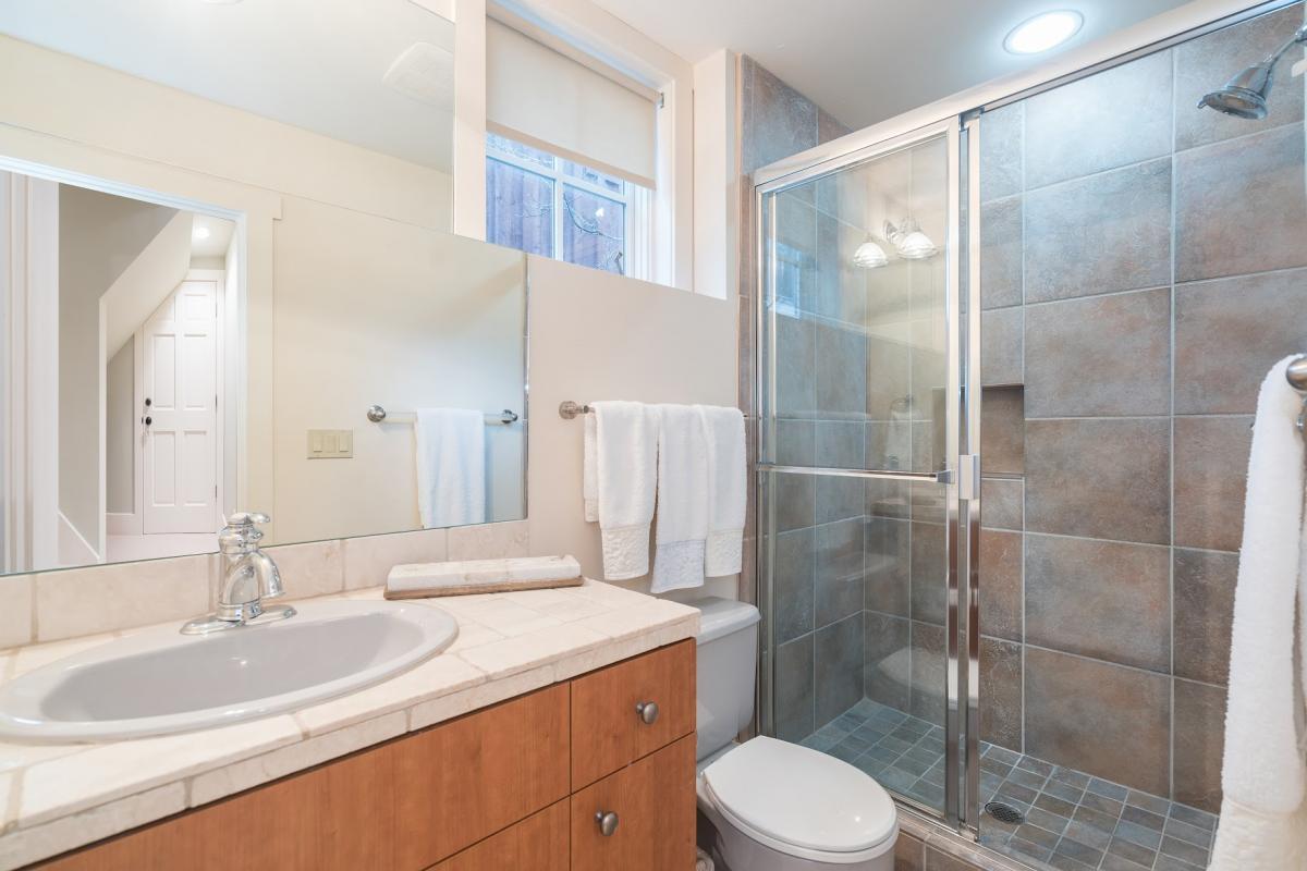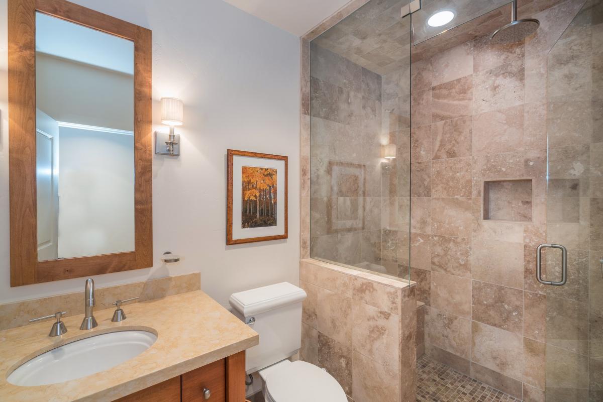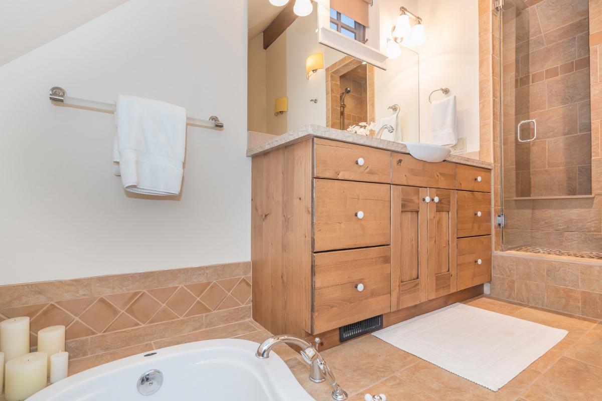 Before reaching the Master Suite, guests pass the door to this property's attached garage, giving space for any vehicle that may be used while exploring Telluride and its surroundings. The entire top floor houses the Master Suite with vaulted wood ceilings, a skylight, queen size bed, built-in work desk, walk-in closet, private balcony and en suite bathroom. The Master bathroom is a true space for luxury and relaxation with an exceptional steam shower with overhead waterfall shower head, two seats and pebbled flooring, along with stone counter top sink and sunken jetted soaking tub.