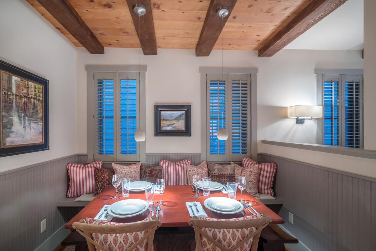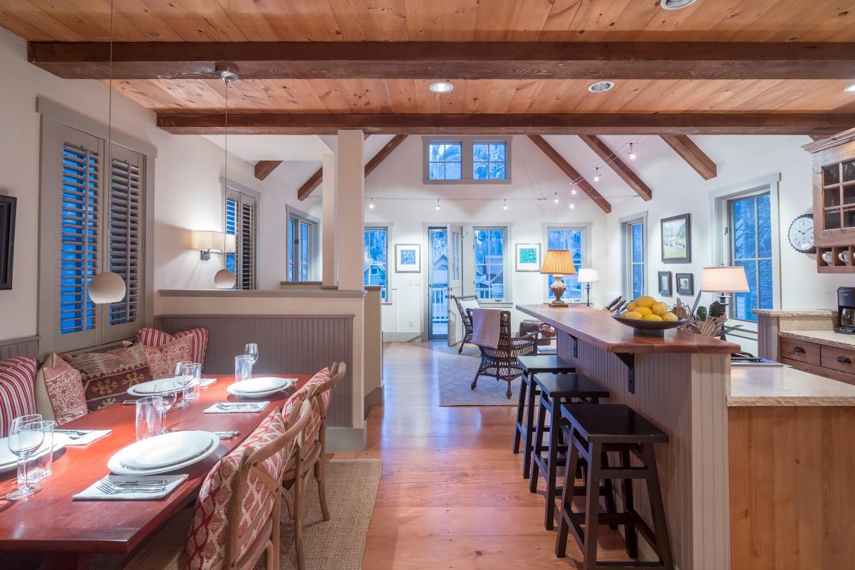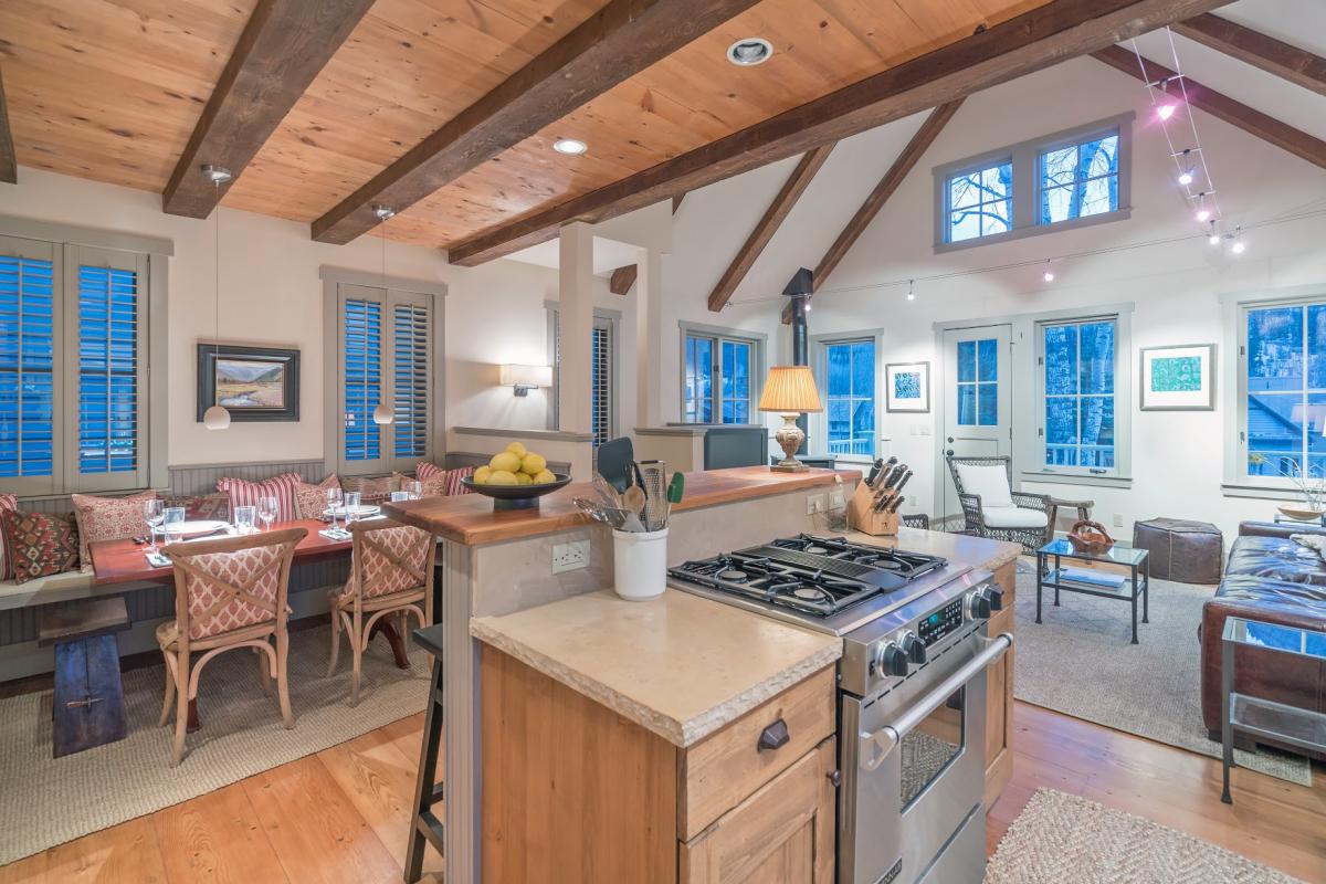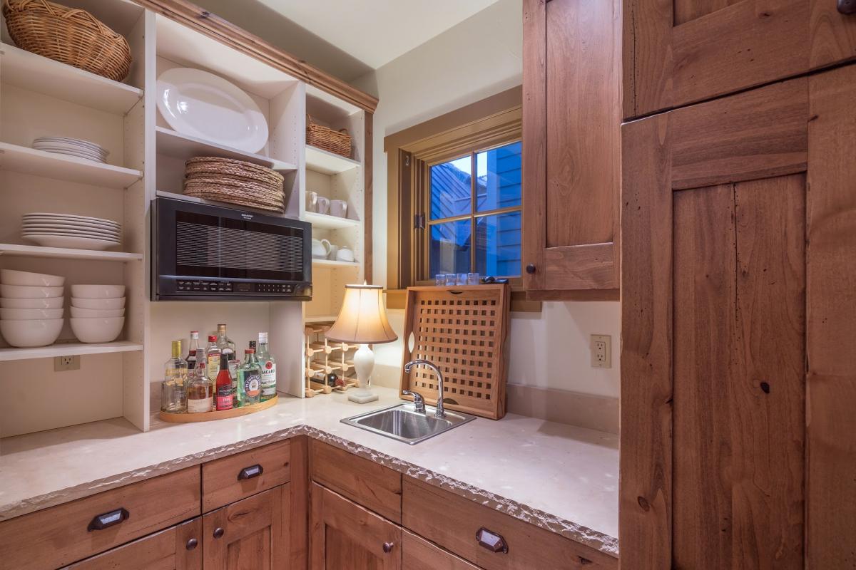 The upper level of the house can be accessed just off this guest room past the laundry room with full washer and dryer and utility sink, or off the stairs from the main entrance. This grand room with vaulted ceiling's and exposed wooden beams, is filled with sunlight from the plethora of windows that surround and large deck just off the room’s south side. The deck is furnished with a round table and seating for four with two additional wicker chairs, and magnificent views of the Box Canyon. The living area is furnished with a flat screen TV, leather couch and two leather chairs with matching ottomans all centered around an iron coffee table. In the corner of the room, the gas fireplace and small window bench make this room perfect to sit and read or enjoy a board game with the family. Flowing into the kitchen with beautiful stone countertops, wood custom cabinets, stainless steel appliances and and breakfast bar for three, this space was designed for family and friends to catch up and make memories together. The dining table with built in bench seat and chairs can seat up to six while overlooking the master chef in the kitchen. An additional pantry with sink, microwave, glassware and additional appliances can be found neighboring this grand space.