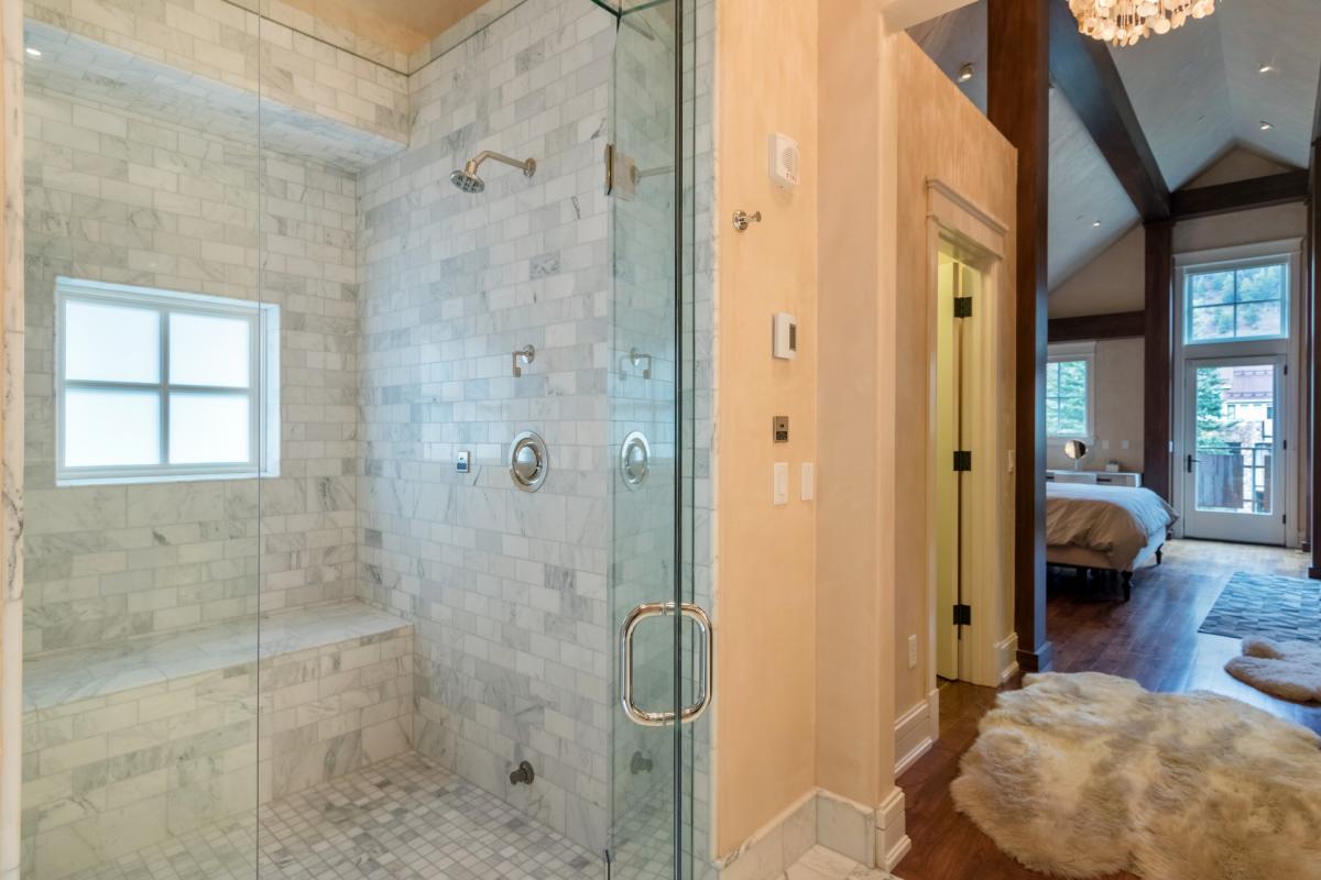 The top level of the home is the perfect escape into the Master Suite. A TempurPedic adjustable king size bed, small desk with chair, gas fireplace and fireplace make this bedroom both comfortable and romantic. Vaulted ceilings trimmed with wooden beam detail let in plenty of light and continue into the Master Bathroom. The perfect place for relaxation, this bathroom is adorned with dual vanity sinks, a steam shower and separate deep soaking tub.