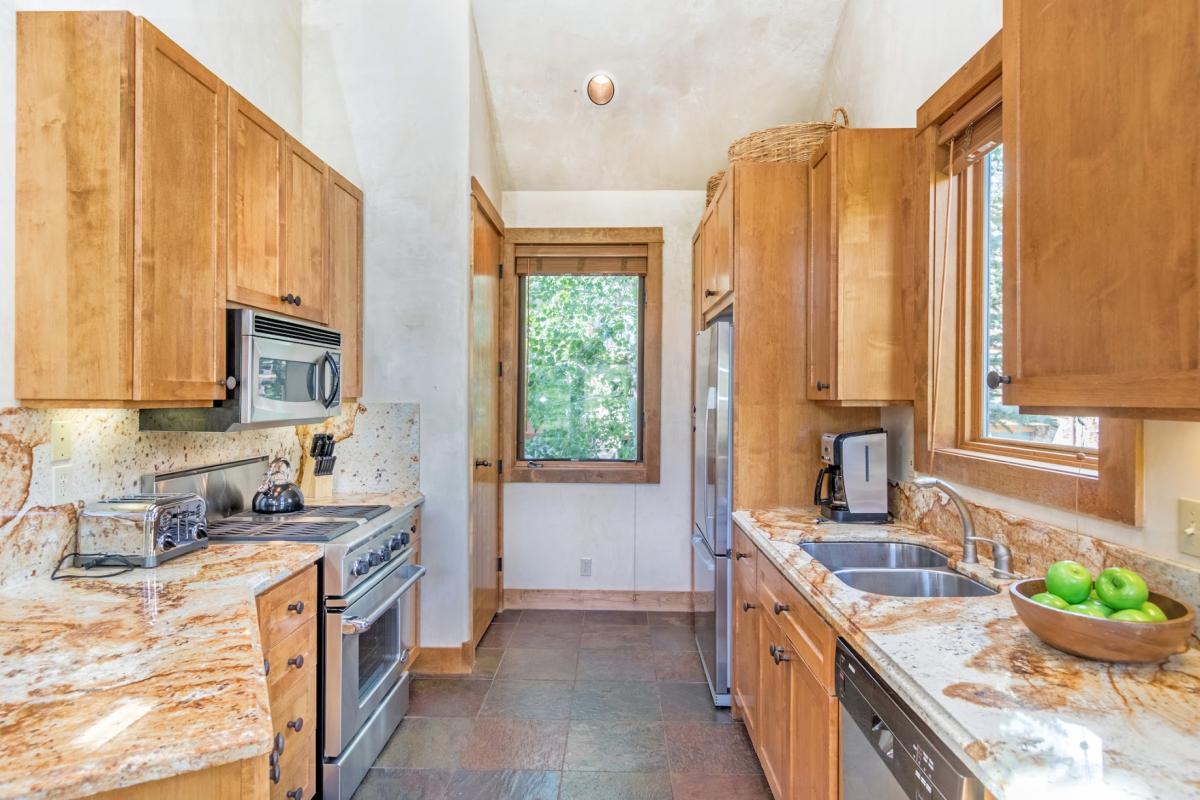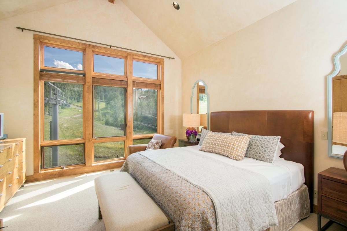 Unit 1102: You can see everything from here: the Meadows ski run plus the awe-inspiring surrounding mountains. This sun-filled upstairs unit has two bedrooms on the main floor. The master bedroom has a king bed with en suite bath and a flat screen TV. The guest bedroom has two twin beds that can be made into a king. The loft overlooks the great room and has two sets of bunk beds, with fulls on the bottom and twins on top. The great room has a dining table that seats eight, a gas fireplace, flat-screen TV with DVD player, and a CD stereo. It doesn't get much better than cooking on the gas grill on your private deck while watching the skiers go by or taking in the spectacular scenery.