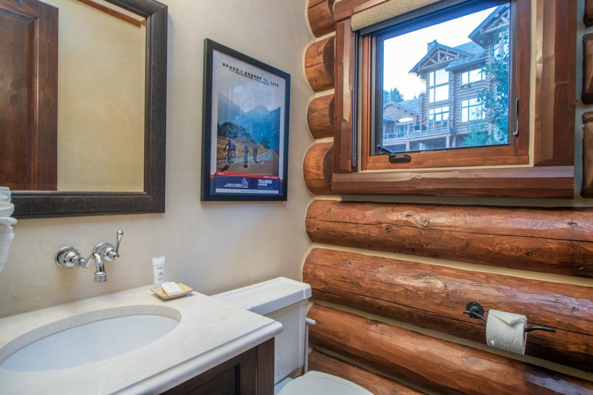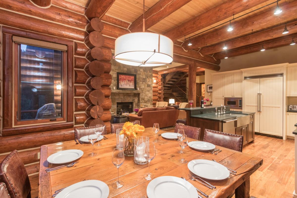 Walk under the traditional log eve through the impressive wood and glass doorway to find the natural light from the Colorado bluebird sky to follow behind. A coat rack made from vintage wooden skis sets the tone for this vacation destination. A guest bath with white stone countertops can be found just beside the door, in perfect convenience. The black slate floor of the foyer leads onto the hardwood floor of the open dining, kitchen and living space with high vaulted ceilings, exposed wooden beam walls and floor to ceiling picture windows. The door to the garage can be found to the right just before entering the living area. Centered around a large stone wall is a gas fireplace with leather sofa, three chairs, and two cow hide ottomans giving comfort and elegant to the space. French doors lead onto the deck with gas grill and seating to gaze upon the beautiful trees and mountains that surround. Beside is the kitchen with granite countertops, Viking stainless steel appliances, custom cabinets and a breakfast bar for four, making the perfect space for cooking and socializing. Adjacent is a dining table for eight surrounded by leather chairs and a wooden bench all overlooking the beautiful San Sofia Ridgeline.
