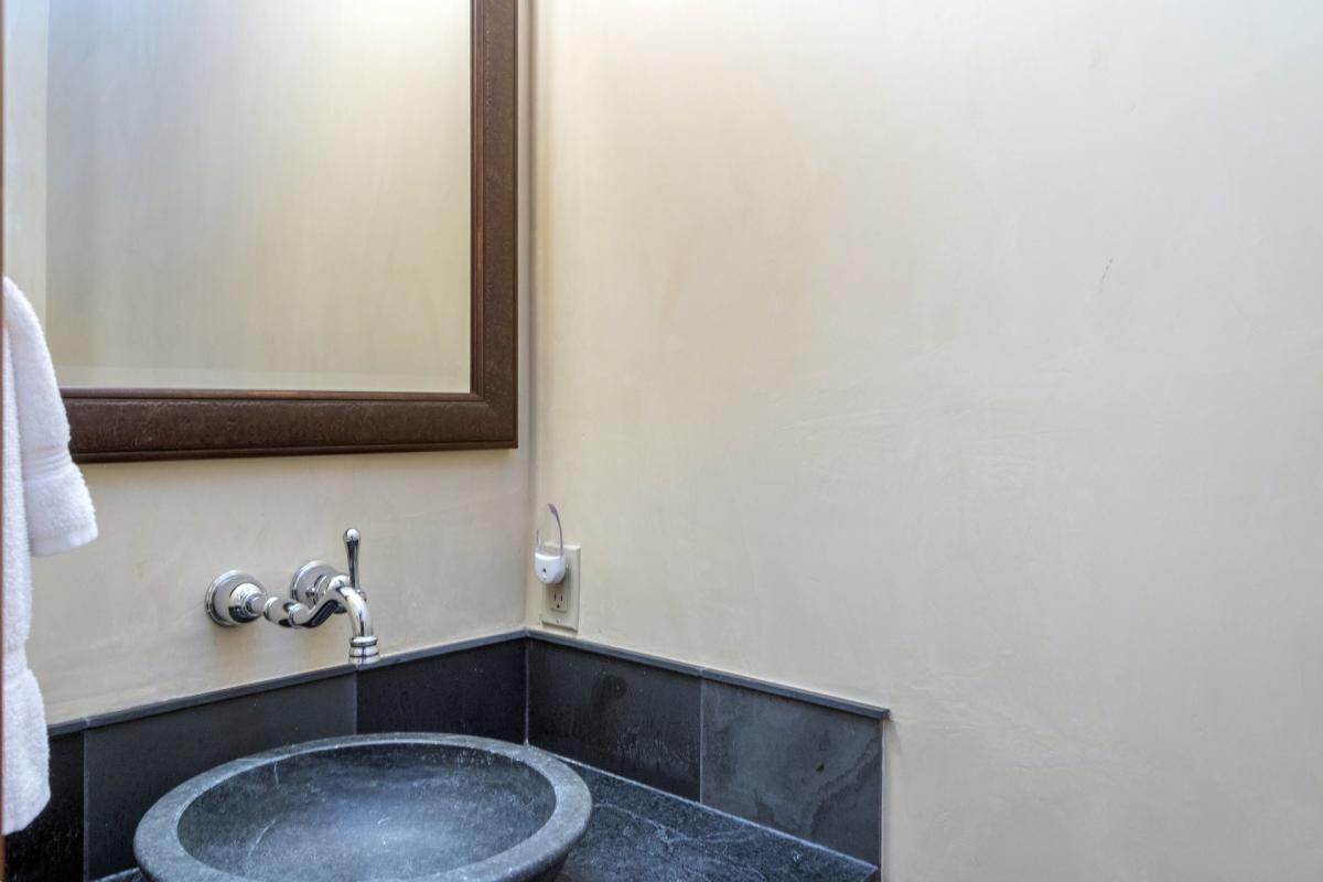 Following the stairway down past the main entrance onto the ground floor, where guests will find the entertainment den, decked out with a leather couch and chair surrounding a large flat screen TV with DVD player. A side entrance is found here with a bench and additional seating just inside with cubbies and ski racks, opportune for storing gear after a day of skiing. Just next to the media room is an extra-large washer and dryer and utility sink in the home’s laundry room. Finally, the last two guest rooms can be found on this lowest level as well. Both fully carpeted with high ceilings, flat screen TVs, custom built-ins and windowed doors leading onto the deck with access to the home’s private hot tub. The first guest room is home to a captain’s bunk with a full size bed on bottom, twin on top and twin trundle bed underneath, as well as an en-suite bathroom with glass shower and waterfall shower head. The other is a split king guest room with en-suite bathroom boasting a shower tub combination and dual vanity sinks.