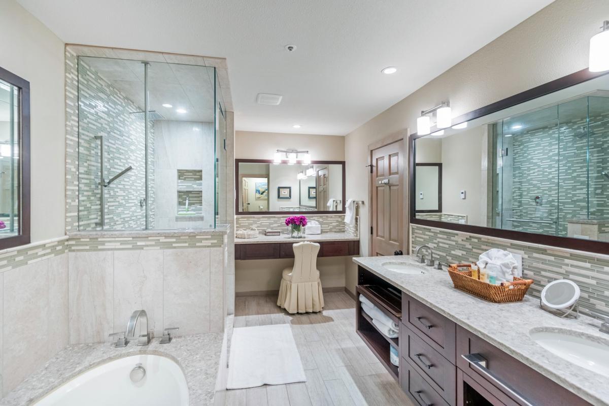This villa's Great Room is home to the living area and kitchen beautifully situationed on the main level. This room features a gas fireplace and comfortable suede camel sofas. Guests of Village Creek 8 are able to relax in conversation or watching a movie on the large flat screen television. A fully equipped gourmet kitchen is complete with anything chefs of all levels can imagine to create delicious meals. Enjoy your creations at the dining table seating eight or bar seating three. Access to the deck and outdoor seating is easy from the Great Room.